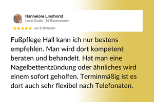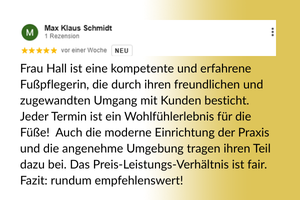 Seit 2020 bin ich selbstständig als Fußpflegerin.  Heute bin ich 52 Jahre alt und bringe nicht nur fachliches Können, sondern auch viel Lebenserfahrung, Geduld und Einfühlungsvermögen in meine Arbeit ein.